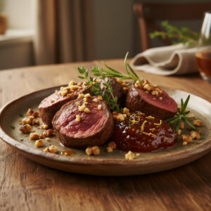 Zart, nussig, fruchtig – dieses Rehgericht verbindet das Aroma von Waldkräutern mit einer fein-süßen Hagebutten-Sauce und knusprigen Walnüssen. Ideal als