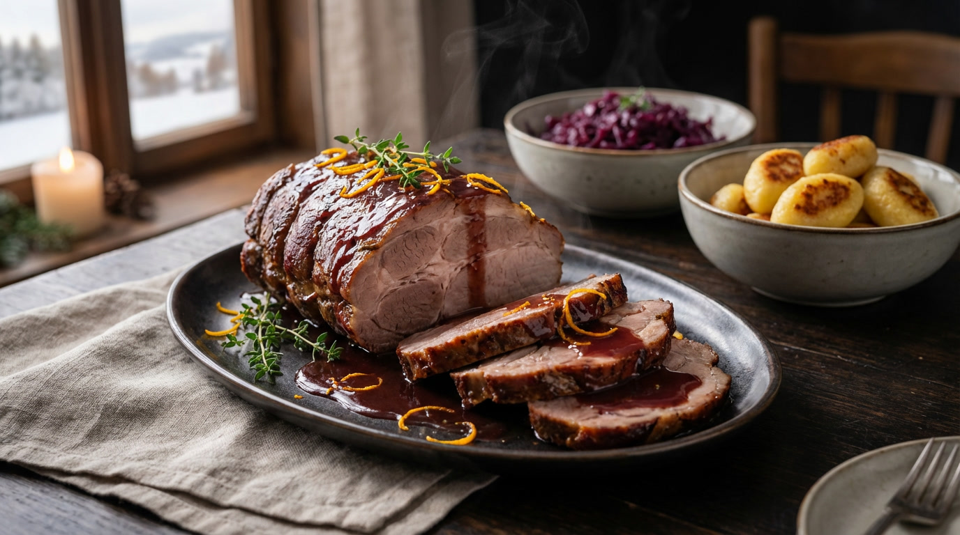 Dieser langsam gegarte Landschweinnacken wird in einer aromatischen Glühwein-Marinade mit Orange, Zimt und Wacholder geschmort und ist wie gemacht für gemütliche Winterabende und Festtage. Das Fleisch bleibt saftig und wird durch das lange Garen wunderbar zart. Landschweinnacken geschmort