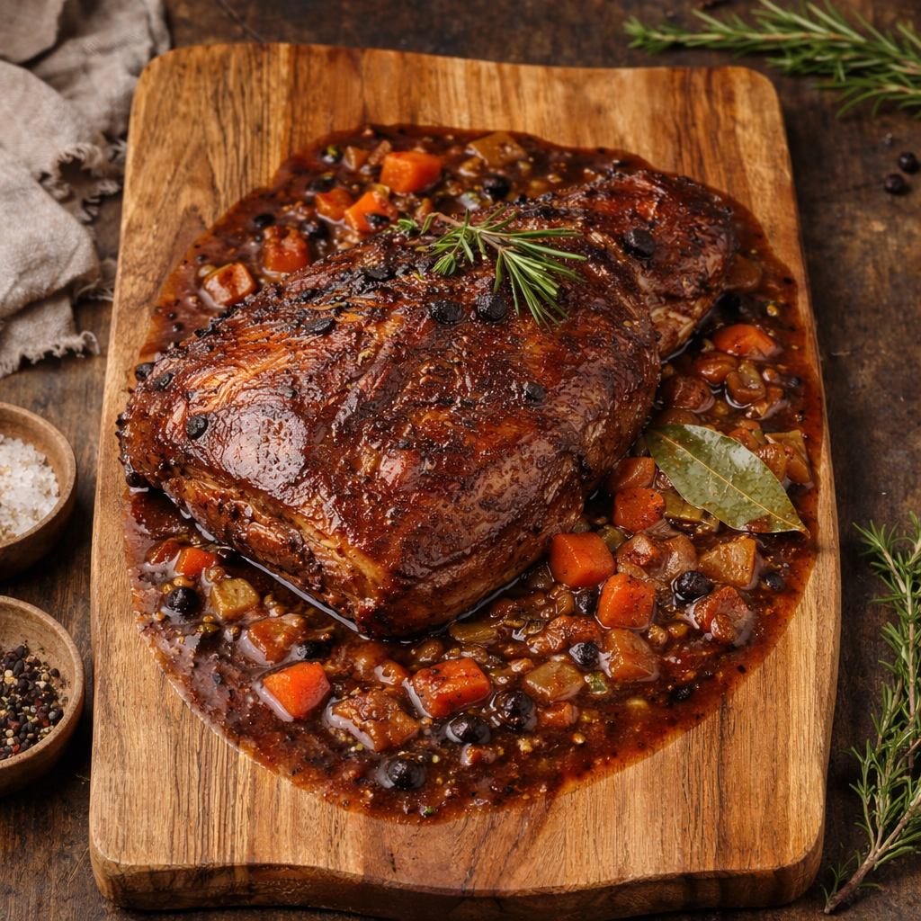 Diese geschmorte Reh-Schulter ist ein klassisches Wildgericht für kühle Tage: kräftig angebraten, mit Rotwein und Fond geschmort und am Ende so zart, dass sich das Fleisch leicht vom Knochen löst. Ideal für ein gemütliches Essen mit Familie oder Gästen.