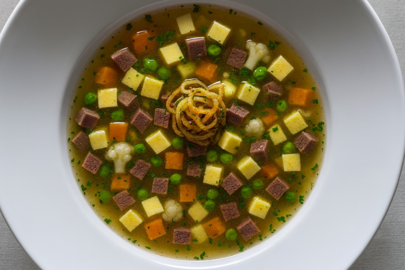 - Eierstich einlegen: Eierstichwürfel zufügen und kurz mitwärmen.