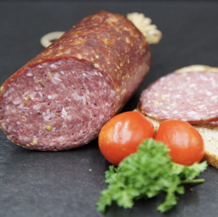 Zutaten: Hirschfleisch, Rehfleisch, tier. Fett, jod. Kochsalz, Gewürze, Geschmacksverstärker E621, Antioxidationsmittel E316, Senf/Senfkörner, Curry