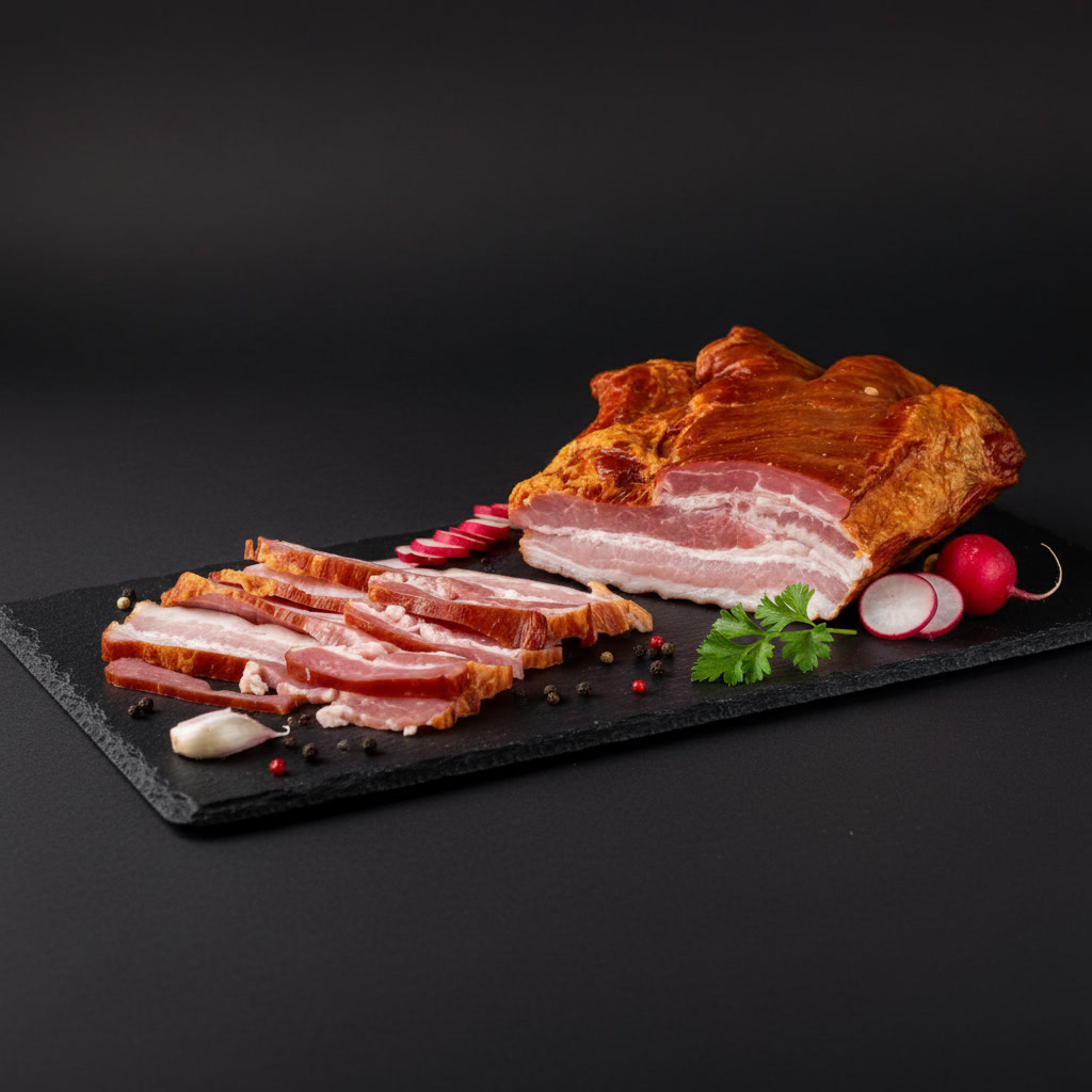 Speck durchwachsen vom Wildschwein mit deftigen Gewürzen und Pökelsalz, geräuchert über Holzrauch.