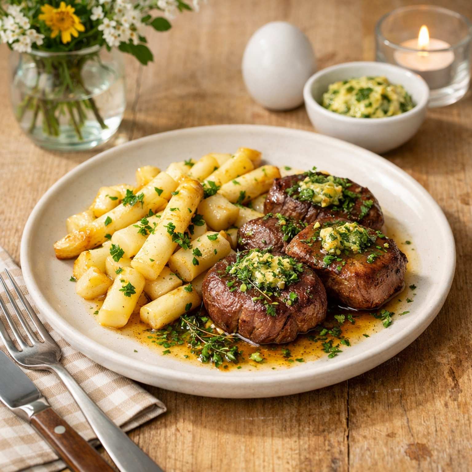 Rehmedaillons gehören zu den edelsten Wildgerichten der Küche. In Kombination mit gebratenem weißen Spargel und einer feinen Kräuterbutter entsteht ein saisonales Highlight, das perfekt in die Spargelzeit passt. Dieses Rezept zeigt dir, wie du Reh perfekt rosa brätst und Spargel aromatisch karamellisierst.