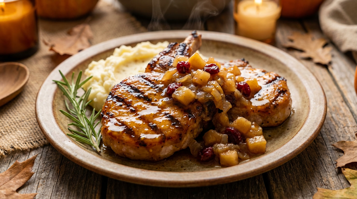 - Schweinekoteletts auf Kartoffelstampf anrichten und das warme Bratapfel-Relish darüber oder daneben geben.