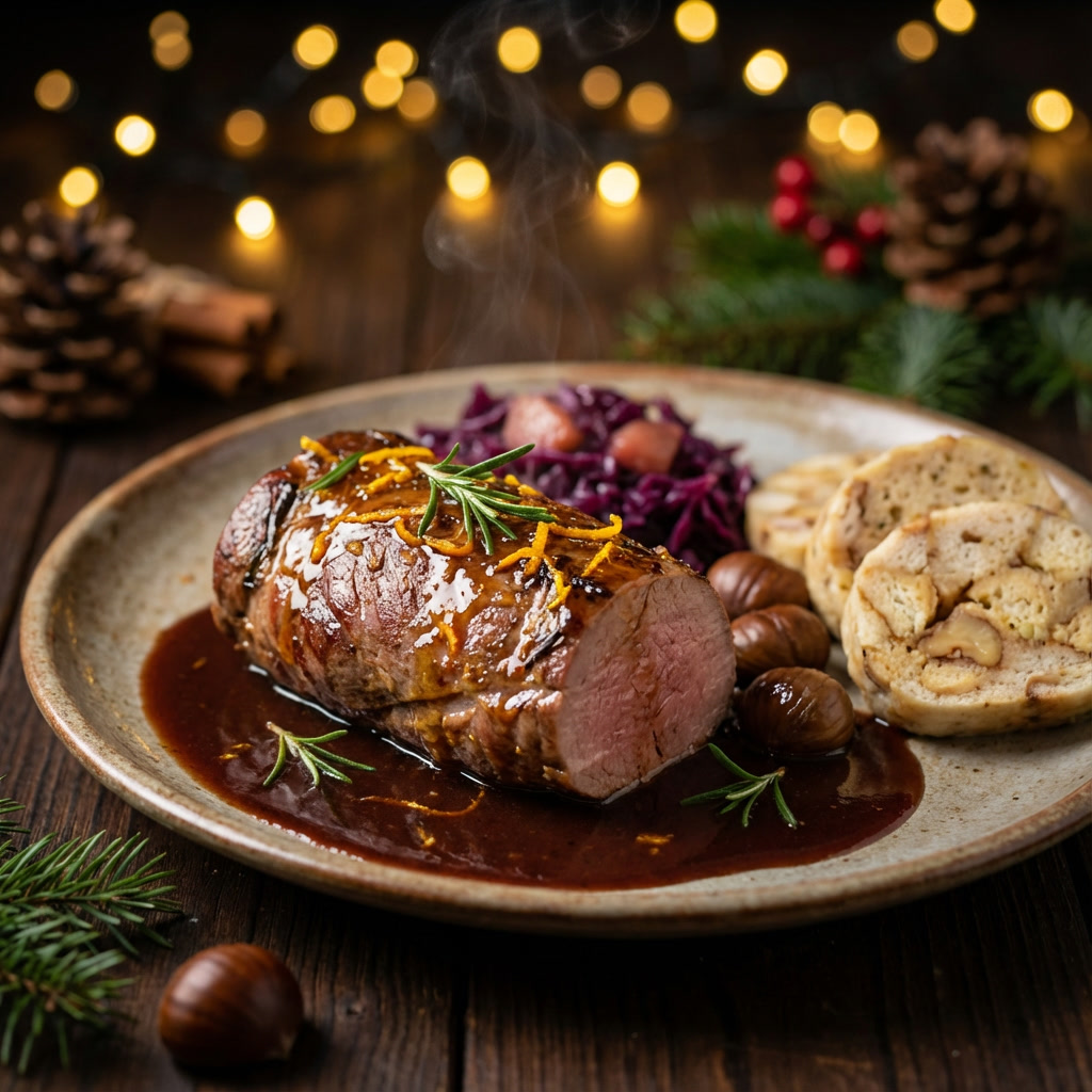 Wildschweinrücken Weihnachtsduft – Honig, Orange, Rosmarin und Rotwein-Sauce