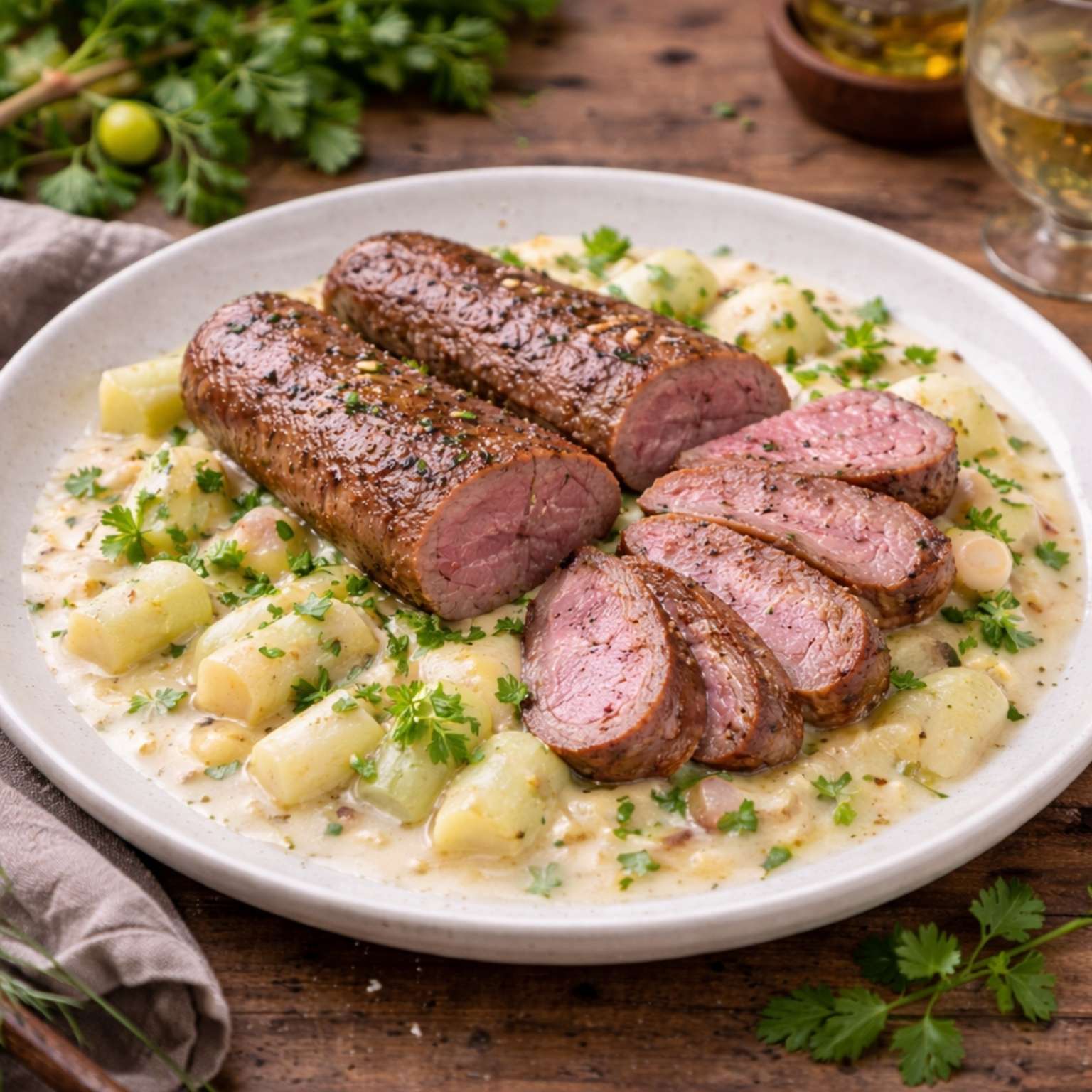 Dieses Wildschwein Filet mit cremigem Spargelragout ist ein elegantes Gericht für besondere Anlässe oder ein gehobenes Frühlingsmenü. Die Kombination aus zartem Wildfleisch und aromatischem weißem Spargel sorgt für ein harmonisches Geschmackserlebnis.