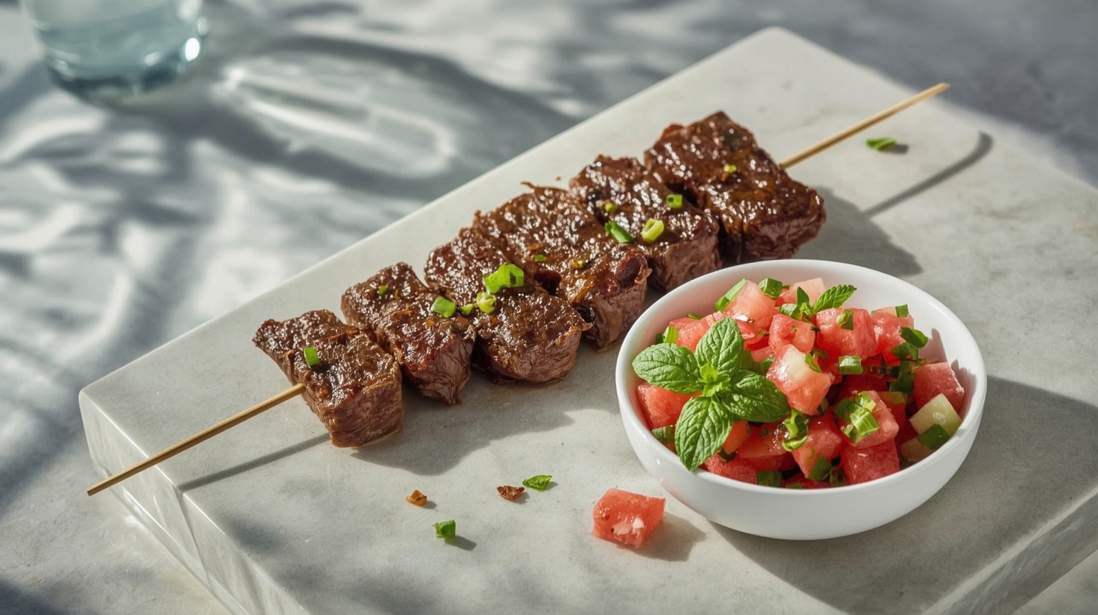 Die gegrillten Wildspieße auf einer großen Platte oder direkt auf Tellern anrichten. Die eiskalte Melonen-Minz-Salsa dazu reichen – entweder als Topping auf den Spießen oder separat in einer Schale.